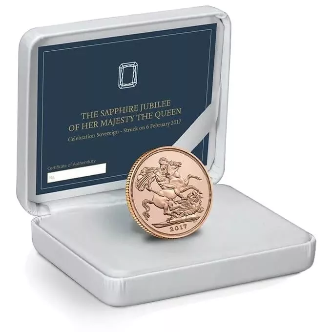 The 2017 "Struck on the Day" Sapphire Jubilee Sovereign struck by The Royal Mint on February 6, 2017, to commemorate Queen Elizabeth II's Sapphire Jubilee, marking 65 years since her accession to the throne. It features the official coinage portrait of the Queen by Jody Clark on the obverse and the classic Benedetto Pistrucci Saint George and the dragon design on the reverse. Only 750 of these Brilliant Uncirculated sovereigns were struck.